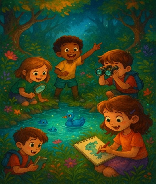 O ônibus escolar estacionou perto do parque. Assim que a turma desceu, todos pararam, boquiabertos. O lago do parque… estava azul! Mas não um azul qualquer — era um azul tão brilhante que parecia que alguém havia derramado o céu dentro dele.