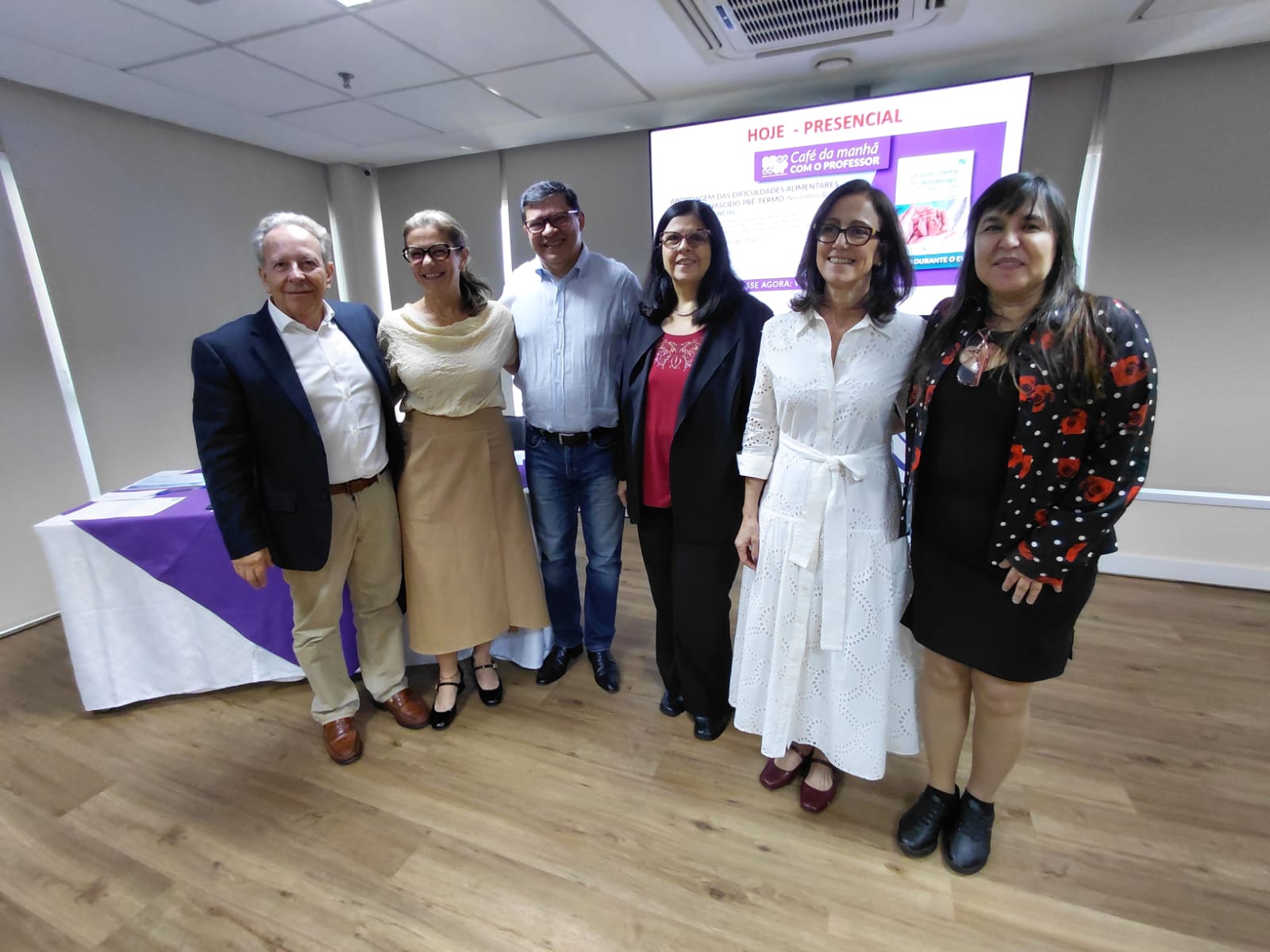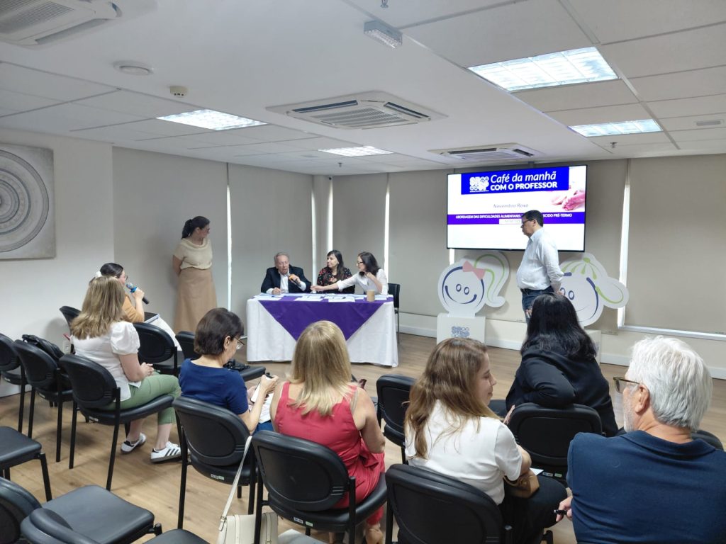 Em comemoração ao Mês da Prematuridade (Novembro Roxo), a SPSP promoveu, no dia 29 de novembro, presencialmente, no auditório da sede da SPSP, o Café da Manhã com o Professor – Abordagem das Dificuldades Alimentares do Recém-Nascido Pré-Termo. Sob organização da Diretoria de Cursos e Eventos e DC de Neonatologia da SPSP, o evento, dirigido a pediatras, teve por objetivo discutir as principais dificuldades alimentares do recém-nascido pré-termo na internação e no seguimento. Na oportunidade, foi sorteado o livro Situações Clínicas em Neonatologia – Bases para o Diagnóstico e Conduta, da série Atualizações Pediátricas.