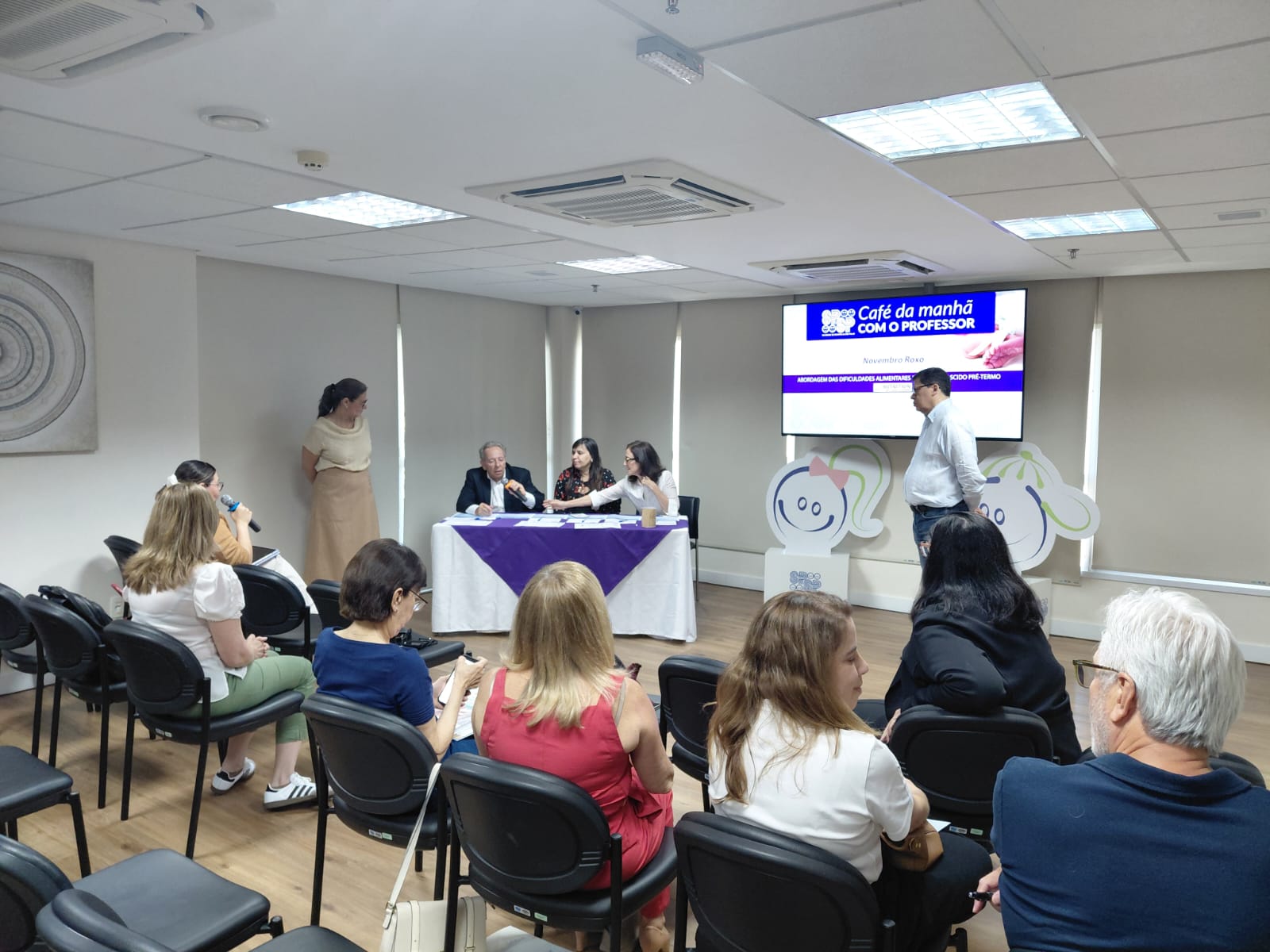 Os temas apresentados no Café da Manhã foram: Dificuldades alimentares na fase neonatal e a atuação da fonoaudiologia, Refluxo gastroesofágico no recém-nascido pré-termo – imaturidade funcional ou doença? e Uso racional de fórmulas lácteas especiais na unidade neonatal. Ao final do evento, houve uma discussão com perguntas do público aos especialistas.