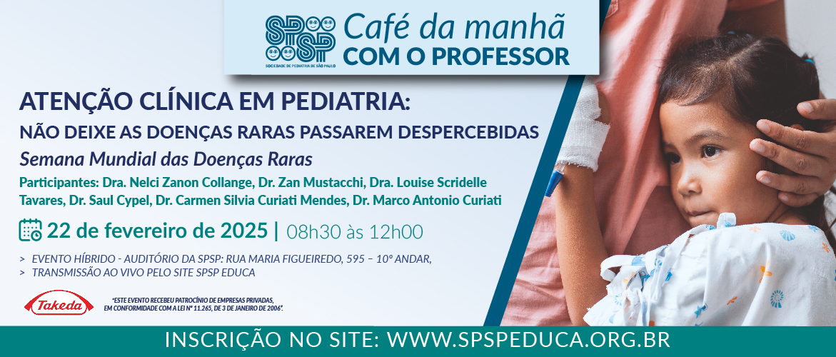 Em 22 de fevereiro, foi realizado o Café da Manhã com o Professor – Atenção Clínica em Pediatria: Não deixe as Doenças Raras passarem despercebidas, em homenagem à Semana Mundial das Doenças Raras. Organizado pela Diretoria de Cursos e Eventos e Departamentos Científicos (DCs) de Neurologia e Neurocirurgia e de Genética da SPSP, o evento, que aconteceu em formato híbrido (presencial, no auditório da SPSP, e on-line, com transmissão ao vivo pelo site SPSP Educa), teve por objetivo promover atualização sobre as doenças raras, diagnósticos e possibilidades terapêuticas, com foco nas mucopolissacaridoses, em especial D. de Hunter.