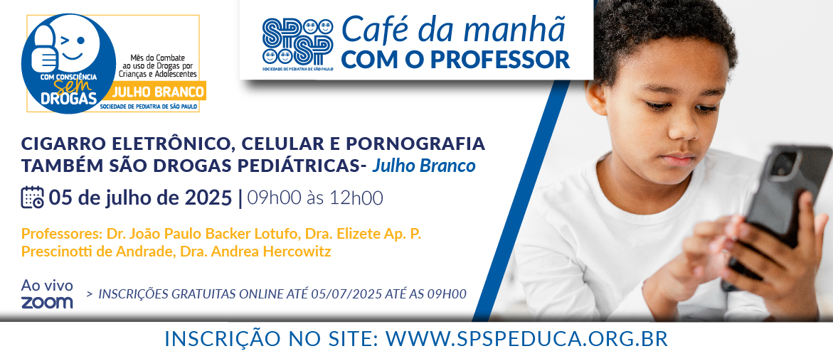 Foi realizado, em 5 de julho, o Café da Manhã com o Professor – Cigarro Eletrônico, Celular e Pornografia também são Drogas Pediátricas, atividade em prol da campanha Julho Branco. Organizado pela Diretoria de Cursos e Eventos e Núcleo de Estudos (NE) de Combate ao Uso de Drogas por Crianças e Adolescentes da SPSP, o evento, que aconteceu ao vivo, com transmissão pela plataforma Zoom da SPSP, teve por objetivo aumentar o conhecimento de todos sobre estas questões terapêuticas.