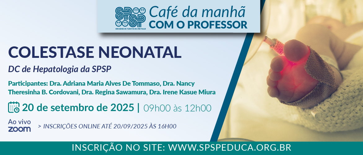 Em 20 de setembro, foi realizado o Café da Manhã com o Professor – Colestase Neonatal, transmitido ao vivo, pela plataforma Zoom da SPSP. Organizado pela Diretoria de Cursos e Eventos e Departamento Científico (DC) de Hepatologia, o evento foi direcionado a pediatras e médicos de família/generalistas que trabalham com puericultura nos serviços públicos., teve por objetivo capacitar os médicos que trabalham com puericultura e neonatos.