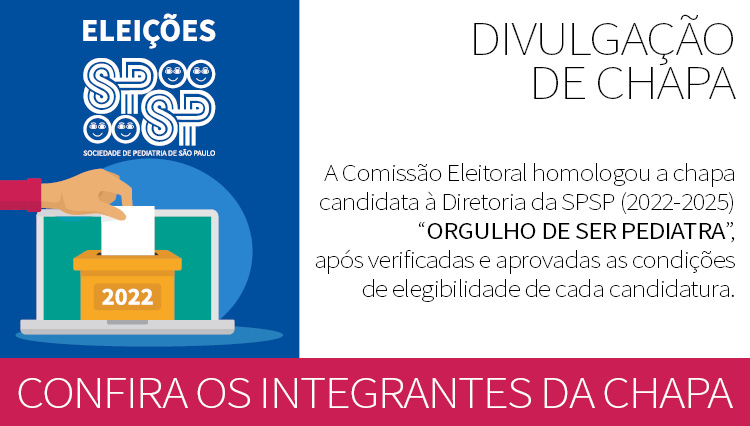 A Comissão Eleitoral homologou a chapa candidata à Diretoria da SPSP (2022-2025) “ORGULHO DE SER PEDIATRA”, após verificadas e aprovadas as condições de elegibilidade de cada candidatura: