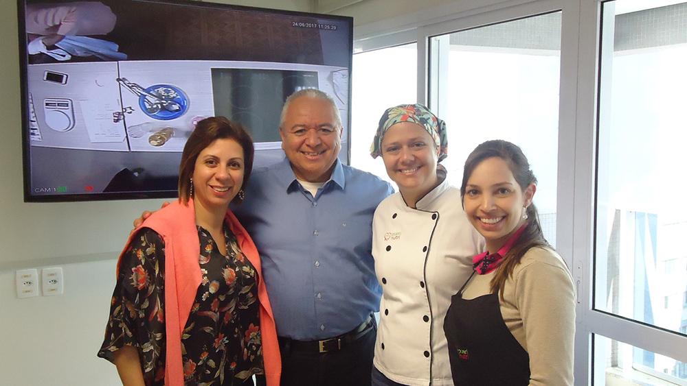 Da esquerda para direita: Renata Rodrigues Aniceto, coordenadora do evento, Tadeu Fernando Fernandes, secretário do Departamento de Pediatria Ambulatorial da SPSP, Fernanda Santos, chef de cozinha, e Flavia Montanari, nutricionista.