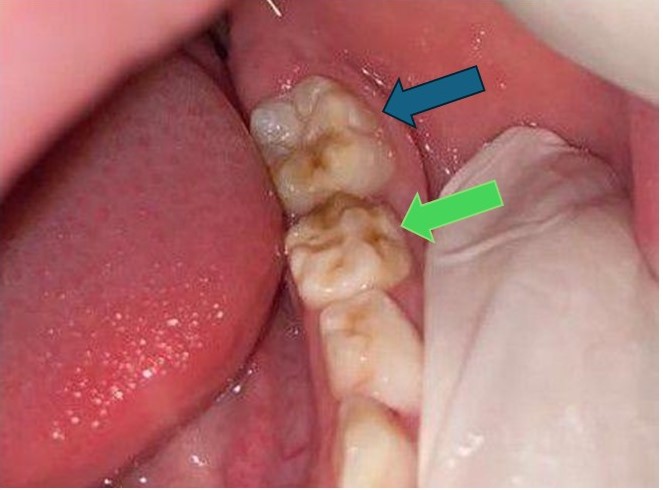 Figura 1. HMI em molar permanente (seta azul) e HMD em molar decíduo (seta verde), em paciente prematuro extremo. Observa-se a alteração de coloração de ambos os dentes, demonstrando manchas branco-opacas e acastanhadas, assim como falta de estrutura dentária no dente decíduo (dente de leite) (seta verde). Imagem cedida por Dra. Juliana Arisi.