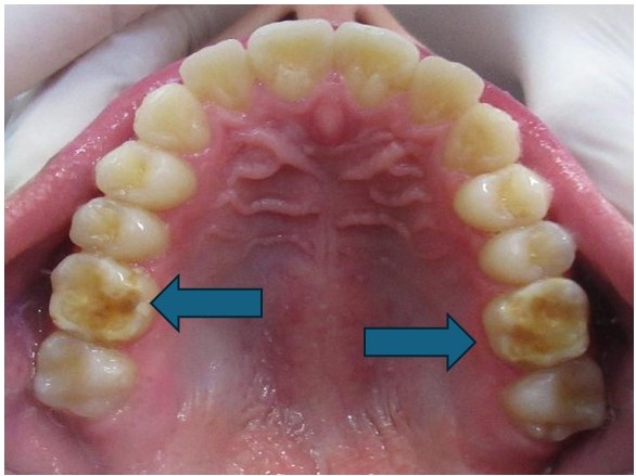 Figura 2. HMI em primeiros molares permanentes superiores. Observa-se perda estrutural associada a opacidades amarelo-acastanhadas. Imagem cedida por Dra. Lucia Coutinho.