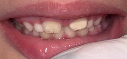Figura 3. Manchas branco-creme decorrentes da HMI em incisivos centrais superiores da dentição permanente. Imagem cedida por Dra. Juliana Arisi.