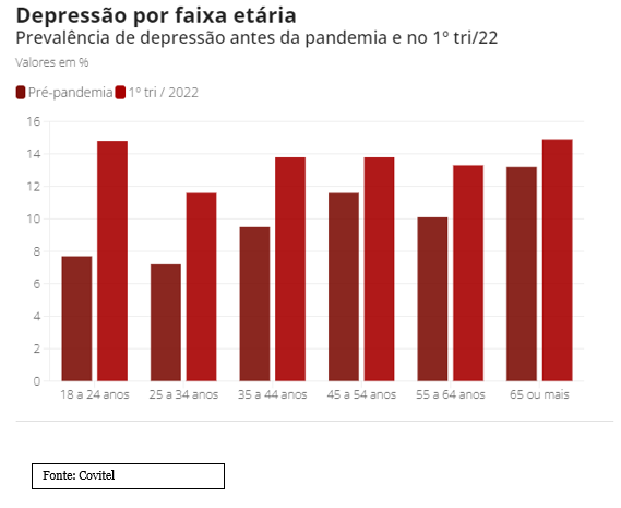 Para 29% dos jovens entrevistados, a pandemia piorou muito seu estado emocional e 41% referiram que piorou um pouco. Isso, somado às incertezas e inseguranças dessa fase da vida, levou a um aumento expressivo das taxas de depressão, principalmente entre pessoas de 18 a 24 anos, como pode ser visto no quadro 2.