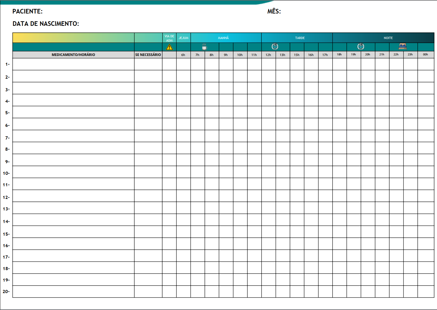 Você pode colocar o nome de cada medicação em uma linha, uma embaixo da outra, e nas colunas, lado a lado, registrar o período do dia/a hora, a quantidade a ser administrada, as observações extras.