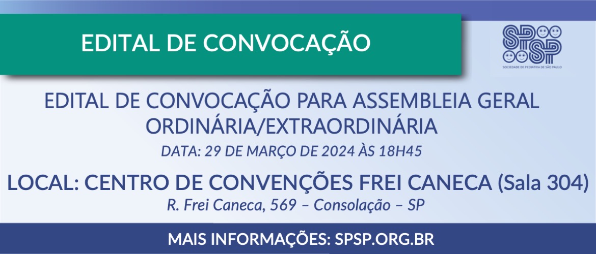 A Presidente da ASSOCIAÇÃO DE PEDIATRIA DE SÃO PAULO, inscrita no CNPJ sob o n.º 43.037.969/0001-40, no uso das atribuições que lhe confere o Estatuto Social, convoca os senhores associados para a ASSEMBLEIA GERAL ORDINÁRIA/EXTRAORDINÁRIA a ser realizada no dia 29 de março de 2024, no Centro de Convenções Frei Caneca – Rua Frei Caneca, nº 569 – sala 304 Consolação, São Paulo – SP, às 18:45 horas em primeira convocação, com a presença mínima da metade dos associados, ou às 19:00 horas em segunda chamada, com qualquer número de associados, nos termos do estatuto social em vigor, a fim de deliberarem sobre a seguinte ordem do dia: