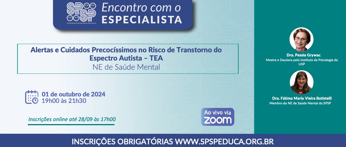 No dia 1º de outubro aconteceu o Encontro com o Especialista, ao vivo com transmissão pela plataforma Zoom da SPSP, para discutir o tema Alertas e Cuidados Precocíssimos no Risco de Transtorno do Espectro Autista (TEA). Organizado pela Diretoria de Cursos e Eventos e Núcleo de Estudos (NE) de Saúde Mental da SPSP, o evento teve por objetivo discutir possibilidades de detecção precoce de risco de TEA e de alterações no desenvolvimento.