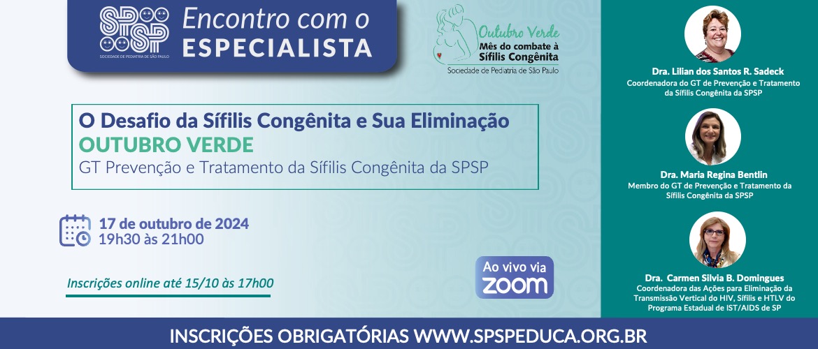 No dia 17 de outubro, aconteceu o Encontro com o Especialista – O desafio da sífilis congênita e sua eliminação, ao vivo, com transmissão pela plataforma Zoom da SPSP, uma ação pela campanha Outubro Verde. O evento foi organizado pela Diretoria de Cursos e Eventos e Grupo de Trabalho (GT) de Prevenção e Tratamento da Sífilis Congênita da SPSP, para discutir a situação atual da sífilis na gestante e a sífilis congênita no Estado de São Paulo, além de abordar as dúvidas mais frequentes dos participantes.