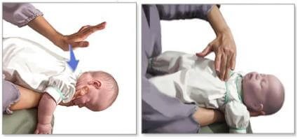 Em menores de um ano, deve-se colocá-los de bruços em cima do braço não dominante, com a cabeça voltada para baixo, e realizar cinco compressões na região das costas, entre as escápulas. Em seguida, rolar o bebê para o outro braço, mantendo sempre a cabeça dele mais para baixo que os pés, colocando-o com a barriga para cima e realizar cinco compressões na região do osso do peito (esterno) utilizando dois dedos, até que o objeto seja expelido. Abrir a boca do bebê e verificar se o objeto pode ser visualizado. Se sim, retirá-lo delicadamente da boca. Caso não seja possível enxergar o objeto na boca do bebê, repetir a manobra (figura 2), até que o objeto seja expelido ou o bebê perca a consciência. Nesse caso, deve-se realizar as manobras para parada cardiorrespiratória.