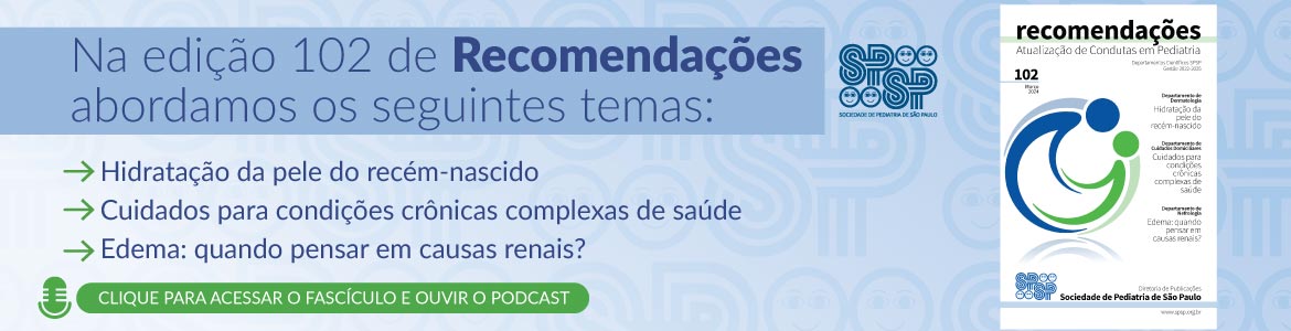 A edição 102 de Recomendações já está disponível no portal da SPSP para download. No primeiro artigo, o Departamento Científico (DC) de Dermatologia aborda a hidratação da pele do recém-nascido. O segundo texto tem como tema cuidados para condições crônicas complexas de saúde, do DC de Cuidados Domiciliares. Por fim, o DC de Nefrologia destaca o edema: quando pensar em causas renais?