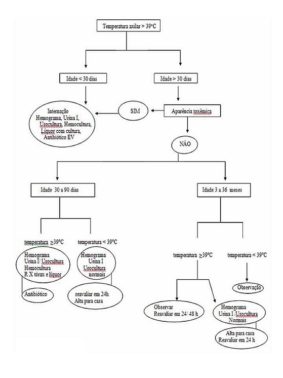 Fegin et al, em 2009, assim como outros autores, sugerem a seguinte conduta no manejo de lactente com febre sem sinais de localização: