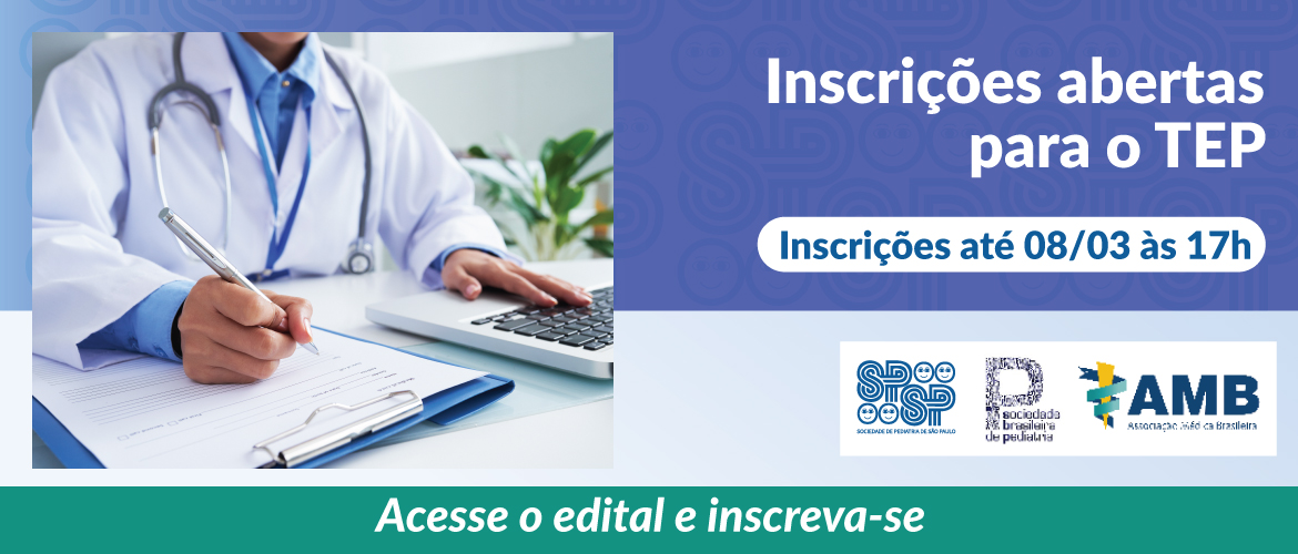 A Sociedade Brasileira de Pediatria (SBP) informa que está com inscrições abertas para o exame de obtenção do Título de Especialista em Pediatria (TEP) e TEP Seriado. As inscrições se encerram às 17h (horário de Brasília) do dia 08 de março de 2024.