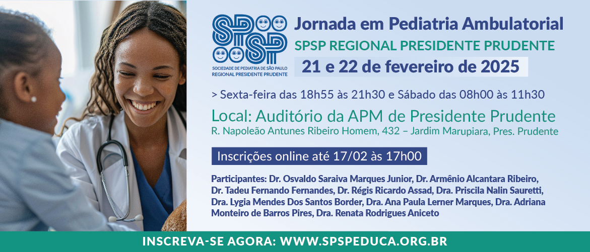 Nos dias 21 e 22 de fevereiro, aconteceu a Jornada de Pediatria Ambulatorial, organizada pela Diretoria de Cursos e Eventos e Regional de Presidente Prudente da SPSP. Realizada de forma presencial, no Auditório da Sociedade de Medicina de Presidente Prudente – APM, a atividade teve como público-alvo pediatras, residentes de pediatria e acadêmicos de medicina.