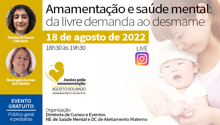 Coordenado por Denise de Sousa Feliciano, presidente do Núcleo de Estudos de Saúde Mental da SPSP, a Live contou com a participação de Rosângela Gomes dos Santos, presidente do DC de Aleitamento Materno da SPSP.