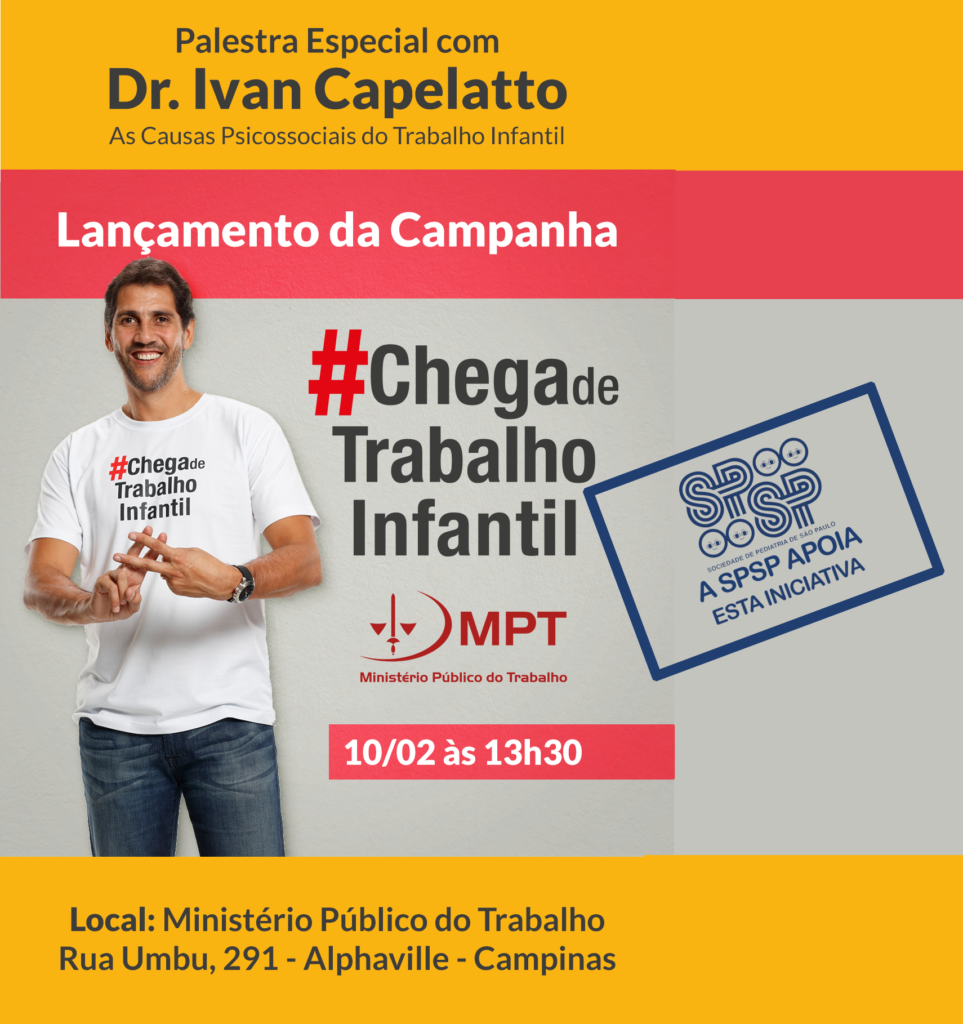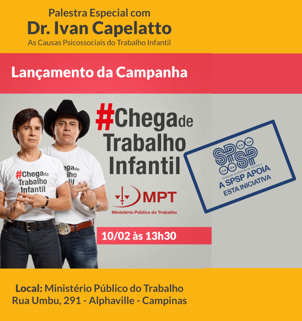 O Ministério Público do Trabalho lançará no próximo dia 10 de fevereiro, em Campinas, uma campanha nacional de combate ao trabalho infantil, intitulada #Chegadetrabalhoinfantil, com o apoio de personalidades da música e dos esportes (os cantores sertanejos Daniel, Chitãozinho e Xororó, o ex-jogador de vôlei Maurício Lima e a ex-jogadora de basquete Hortência Marcari). Voltada para o ambiente online, a campanha buscará o engajamento dos internautas nas redes sociais, incentivando-os a postar o gesto da “hashtag” em seus perfis como forma de apoio à causa contra o trabalho irregular de crianças e adolescentes. O evento de lançamento, que acontecerá na sede do MPT Campinas, às 13h30, contará com a presença do palestrante e psicoterapeuta Ivan Capelato, que falará sobre as causas psicossociais do trabalho infantil.