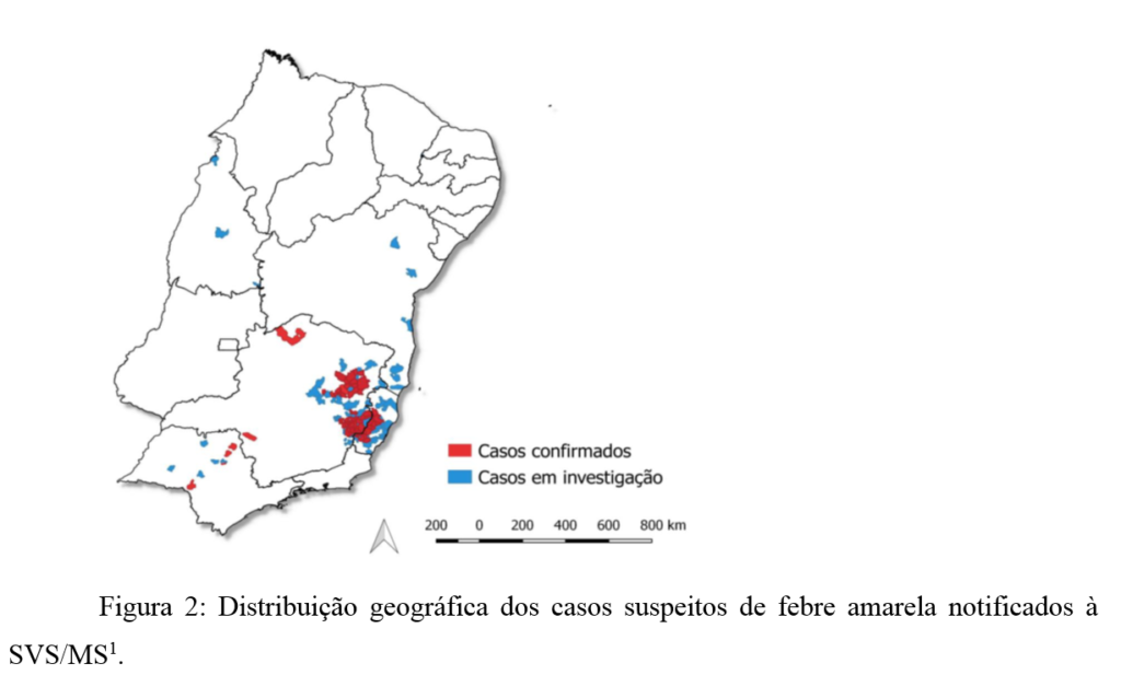 A partir de Dezembro de 2016, até o dia 23 de fevereiro de 2017, foram notificados ao Ministério da Saúde 1.345 casos suspeitos de febre amarela silvestre, desses, 925 (68,8%) casos permanecem em investigação, 295 (21,9%) casos foram confirmados e 125 (9,3%) foram descartados. Os casos confirmados tiveram como local provável de infecção os estados de São Paulo (4 casos), Espirito Santo (45 casos) e Minas Gerais (246 casos)1 – figura 2.