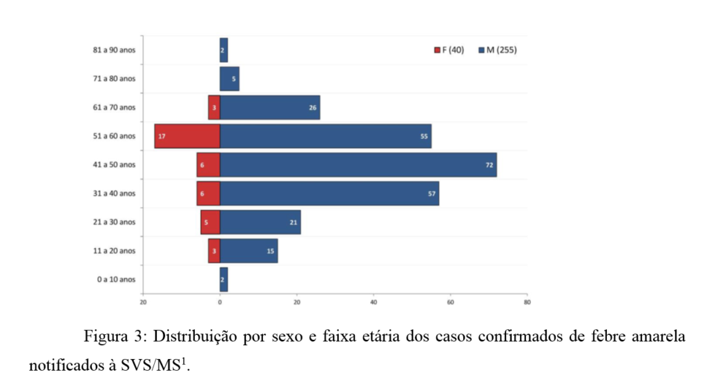 O perfil demográfico dos casos confirmados coincide com aquele geralmente observado nos surtos de febre amarela silvestre, com a maior parte dos casos em pacientes do sexo masculino (87% dos casos) e idade economicamente ativa, uma vez que esses indivíduos se expõem com maior frequência a áreas e situações de risco, sobretudo em decorrência de atividades laborais1 (figura 3).