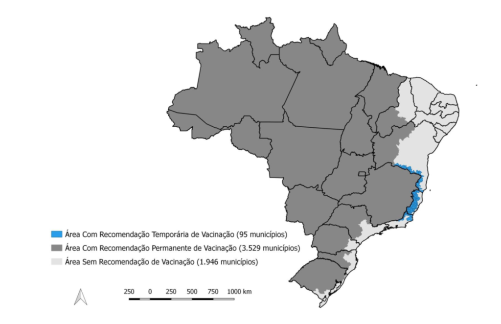 O Ministério recomenda a vacinação nas ações de rotina dos programas de imunizações (Calendário Nacional de Vacinação), em residentes da Área Com Recomendação de Vacina (http://bit.ly/mun_vacina_fa) e em viajantes que se deslocam para essa área, conforme o mapa abaixo (figura 4). Nestes casos, a vacina deve ser administrada pelo menos 10 dias antes da viagem, no caso de primeira vacinação. O prazo de 10 dias não se aplica no caso de revacinação7,11.
