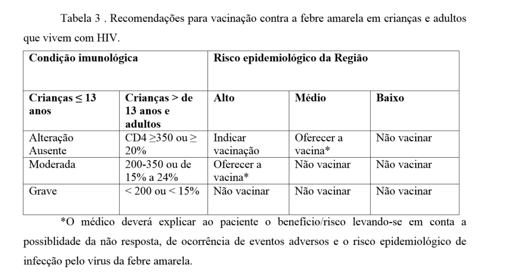 A administração da vacina de febre amarela deverá levar em conta a condição imunológica do paciente que vive com HIV e a situação epidemiológica do local onde a vacinação está sendo indicada23 (tabela 3).
