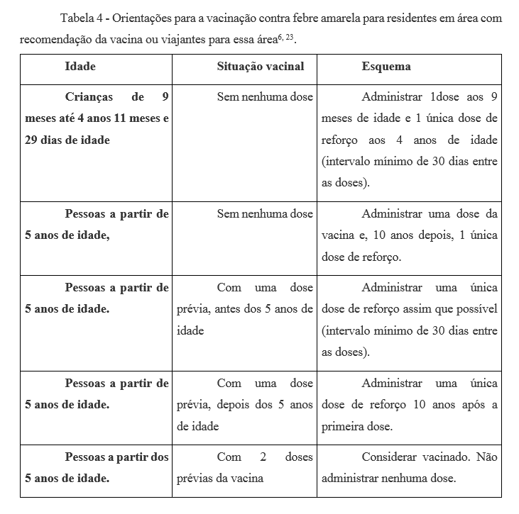 Tabela 4 – Orientações para a vacinação contra febre amarela para residentes em área com recomendação da vacina ou viajantes para essa área6, 23.