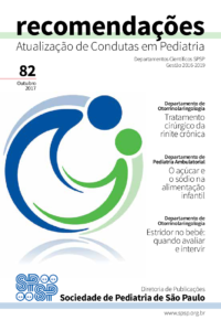 Está disponível em nosso portal a edição número 82 de Recomendações que traz o artigo O açúcar e o sódio na alimentação infantil, do Departamento de Pediatria Ambulatorial e Cuidados Primários da SPSP. Traz também dois artigos do Departamento de Otorrinolaringologia da SPSP: um deles aborda o tratamento cirúrgico da rinite crônica; o outro trata do estridor no bebê, orientando quando avaliar e intervir.