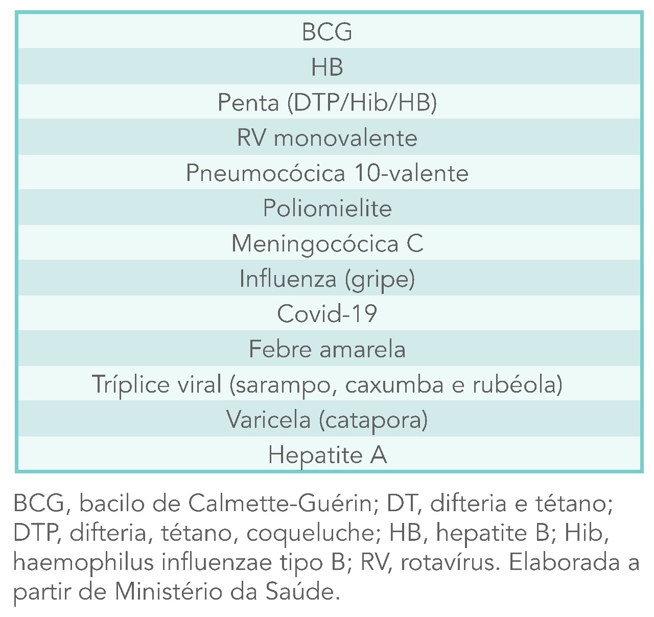 - Ministério da Saúde. Calendário Nacional de Vacinação. Disponível em: https://www.gov.br/saude/pt-br/assuntos/saude-de-a-a-z/c/calendario-de-vacinacao. Acesso em setembro 2022.