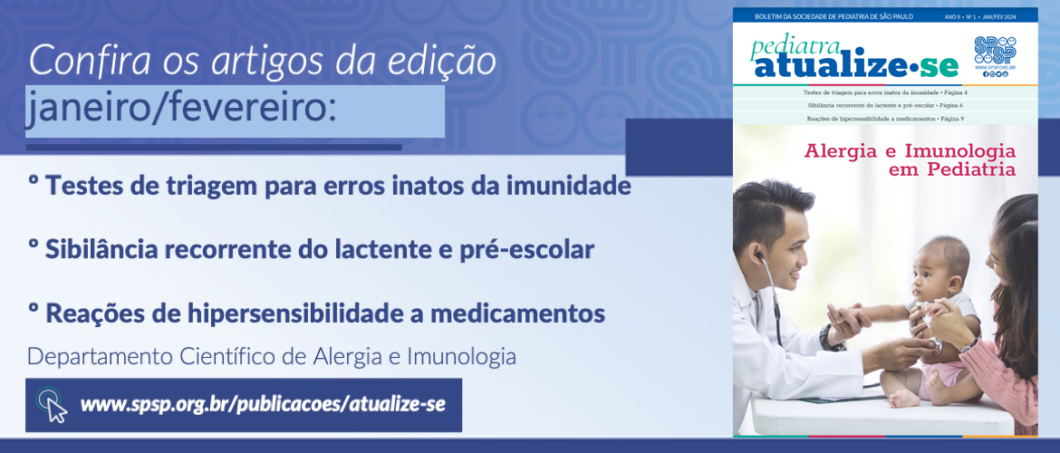 A edição de janeiro/fevereiro do Pediatra Atualize-se tem como tema principal a alergia e imunologia em Pediatria. Os assuntos abordados nesta edição são testes de triagem para erros inatos da imunidade, sibilância recorrente do lactente e pré-escolar e reações de hipersensibilidade a medicamentos. O conteúdo foi elaborado pelo Departamento Científico de Alergia e Imunologia da SPSP.
