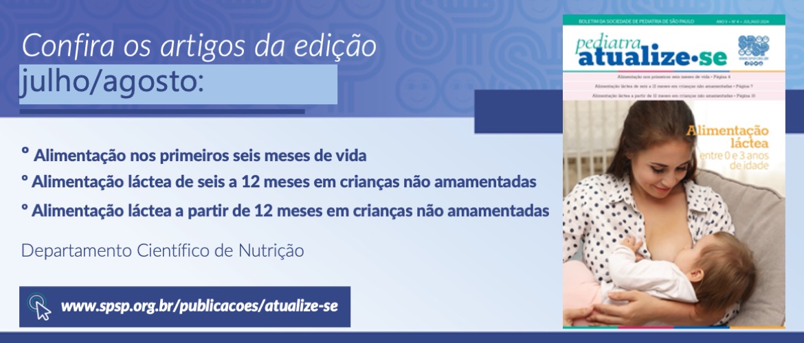 A edição julho/agosto do boletim Pediatra Atualize-se tem como tema principal a Alimentação Láctea entre 0 e 3 anos de idade. Os assuntos abordados nesta edição são alimentação nos primeiros seis meses de vida, alimentação láctea de seis a 12 meses e a partir de 12 meses em crianças não amamentadas. O conteúdo foi elaborado pelo Departamento Científico de Nutrição da SPSP.