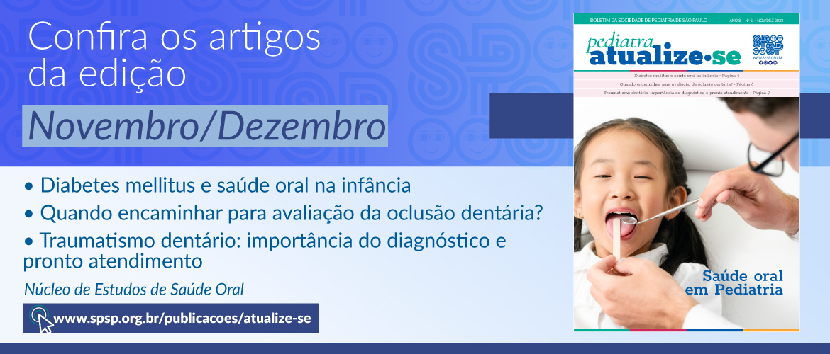 A edição de novembro/dezembro do boletim Pediatra Atualize-se tem como tema principal a saúde oral em Pediatria. Os assuntos abordados nesta edição são diabetes mellitus e saúde oral na infância, quando encaminhar para avaliação da oclusão dentária? e traumatismo dentário: importância do diagnóstico e pronto atendimento. O conteúdo foi elaborado pelo Núcleo de Estudos de Saúde Oral da SPSP.