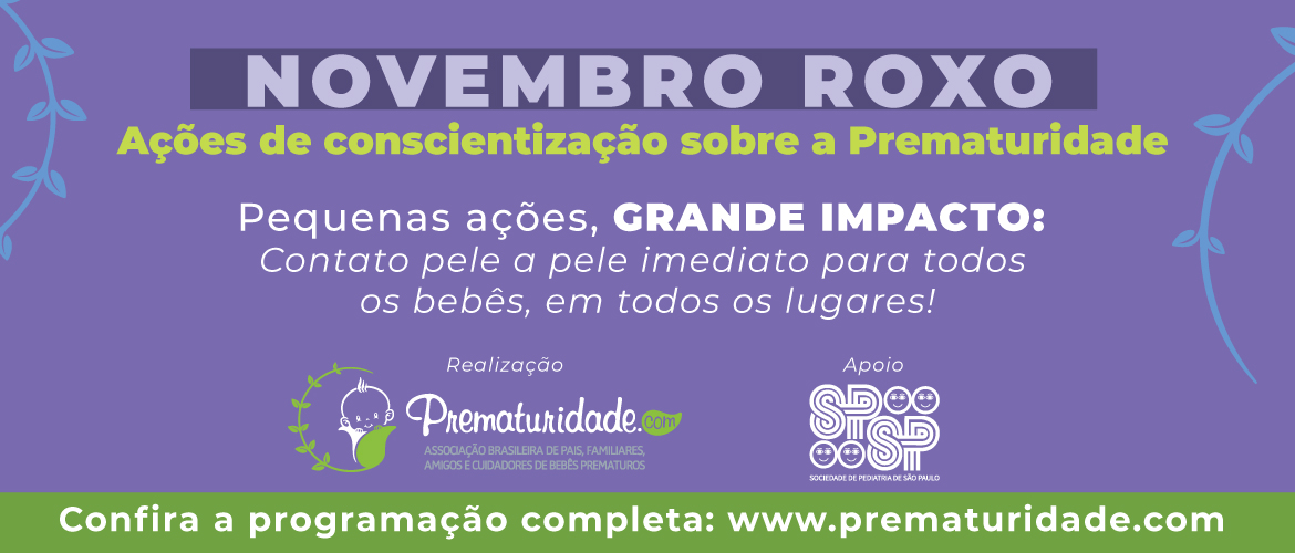 A Sociedade de Pediatria de São Paulo (SPSP) apoia as diversas ações que serão realizadas neste mês em comemoração ao “Novembro Roxo – Mês da Prematuridade”, promovida pela Associação Brasileira de Pais, Familiares, Amigos e Cuidadores de Bebês Prematuros (ONG Prematuridade.com). Com o tema “Pequenas ações, GRANDE IMPACTO: contato pele a pele imediato para todos os bebês, em todos os lugares”, a campanha, que também engloba o “Dia Mundial da Prematuridade”, comemorado em 17 de novembro, tem por objetivo promover uma sensibilização para a questão da prematuridade, chamando a atenção da população para as causas e consequências do nascimento prematuro