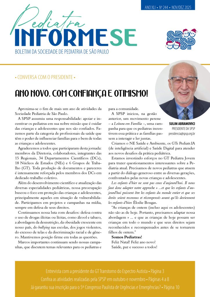 Boletim: Pediatra Informe-se é o canal direto da Diretoria Executiva e Plena da SPSP, a publicação conta nossa história através das gestões. Desde 2005 a diretoria propôs manter uma versão digital do informativo com o objetivo garantir que a atualização seja lida pelos os associados.