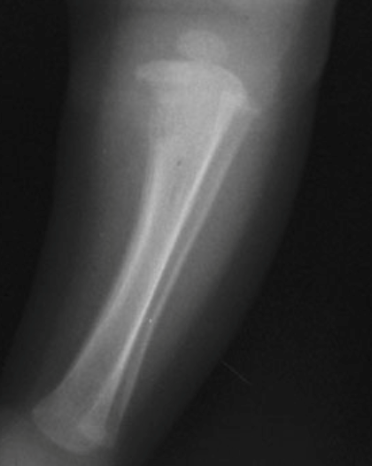 Na sífilis congênita precoce (diagnóstico antes dos 2 anos de idade) ocorre caracteristicamente uma metafisite e o acometimento simétrico de múltiplos ossos. Observa-se um alargamento da metáfise e as epífises são poupadas. Com a fragilidade óssea, é comum a ocorrência de fraturas patológicas. Um achado clínico nessa fase é a pseudoparalisia dos membros, a pseudoparalisia de Parrot, que é decorrente da metafisite e não de uma alteração neurológica ou muscular. O sinal de Wimberger é um sinal radiológico característico da sífilis congênita e é evidenciado pela destruição medial da metáfise proximal da tíbia (FIGURA 2).