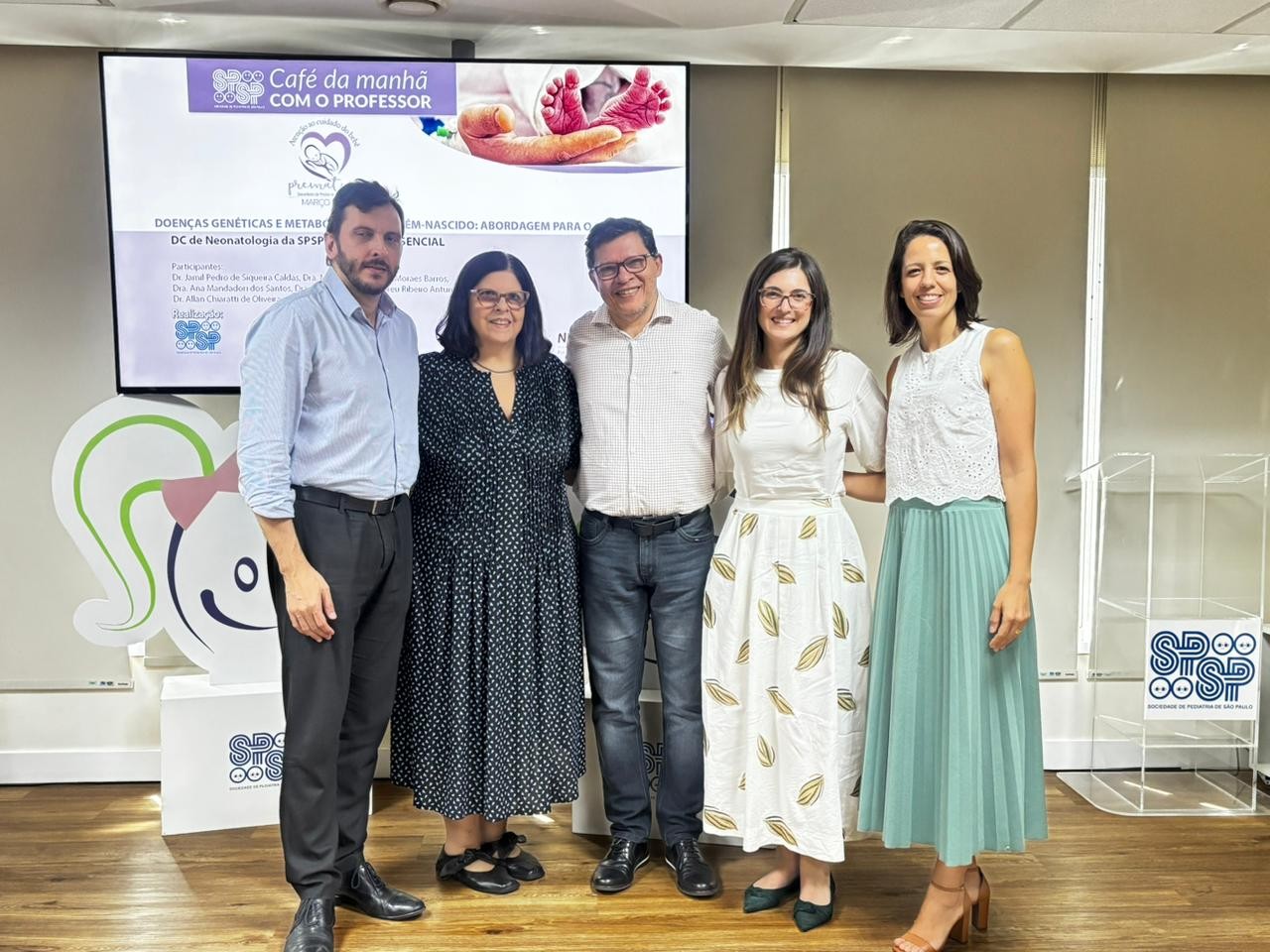 Sob coordenação de Jamil Pedro de Siqueira Caldas, presidente do DC de Neonatologia da SPSP, que também realizou a abertura da atividade e foi moderador da mesa em conjunto com Marina Carvalho de Moraes Barros, vice-presidente do DC de Neonatologia da SPSP, o Café da Manhã teve a presença de Ana Mondadori dos Santos, médica assistente Geneticista da Divisão de Neonatologia da CAISM–UNICAMP, Vanessa Catarine Abreu Ribeiro Atunes, neurologista infantil do Hospital das Clínicas da Faculdade de Medicina da USP, e Allan Chiaratti de Oliveira, professor adjunto da Disciplina de Pediatria Neonatal da EPM–UNIFESP.