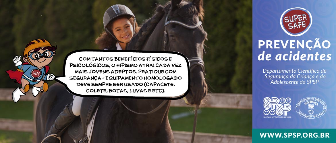 O personagem Super Safe, do Departamento Científico de Segurança da Criança e do Adolescente da SPSP, faz um importante alerta sobre cuidados na prática do hipismo.
